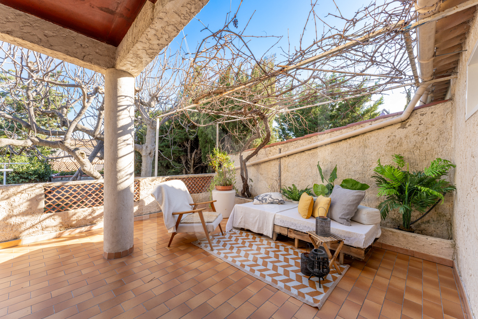 Ici, on ne subit pas l’extérieur : on le choisit, selon l’heure, la saison, l’humeur du jour. Soleil ou ombre, coin vivant ou coin plus intime, la maison offre cette liberté rare de changer d’atmosphère sans changer d’adresse.